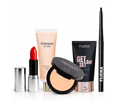 FLiCKA Make Up Kit Combo | Get Set Go Primer, Compact Powder (Caramel), Foundation, Eye Kajal, Bullet Lipstick (Shade - 22) | Perfect For Everyday Glam Look | Pack of 5
